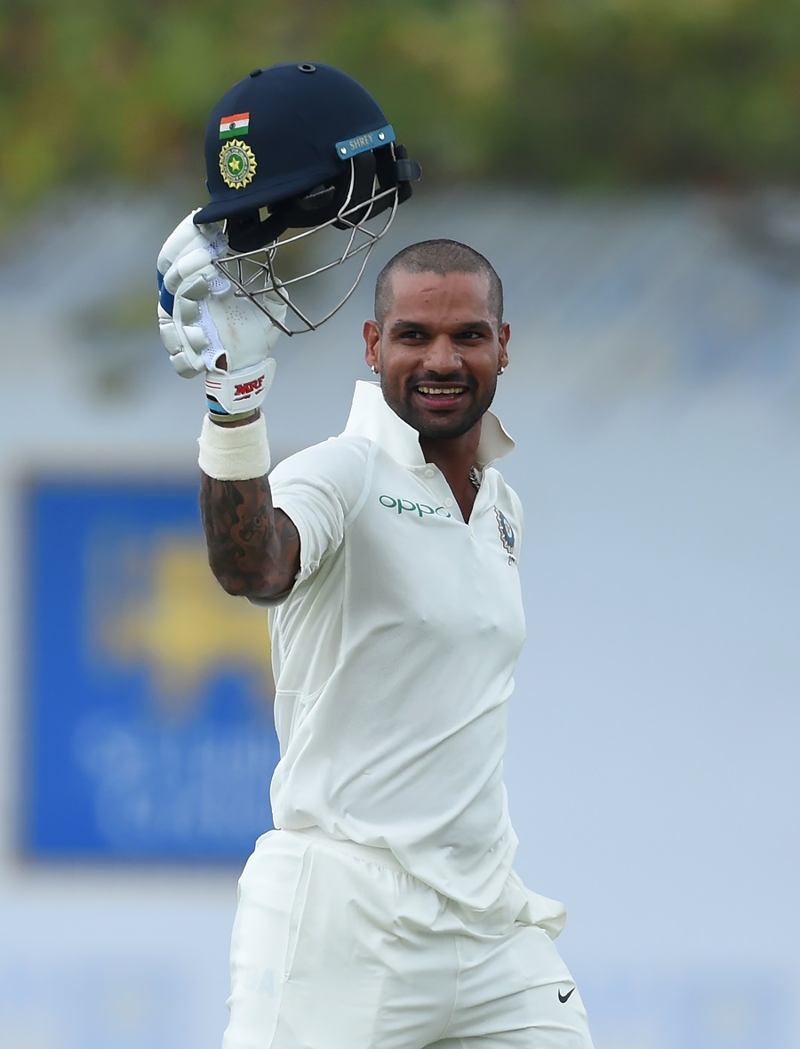 Dhawan celebrates after scoring his fifth Test century