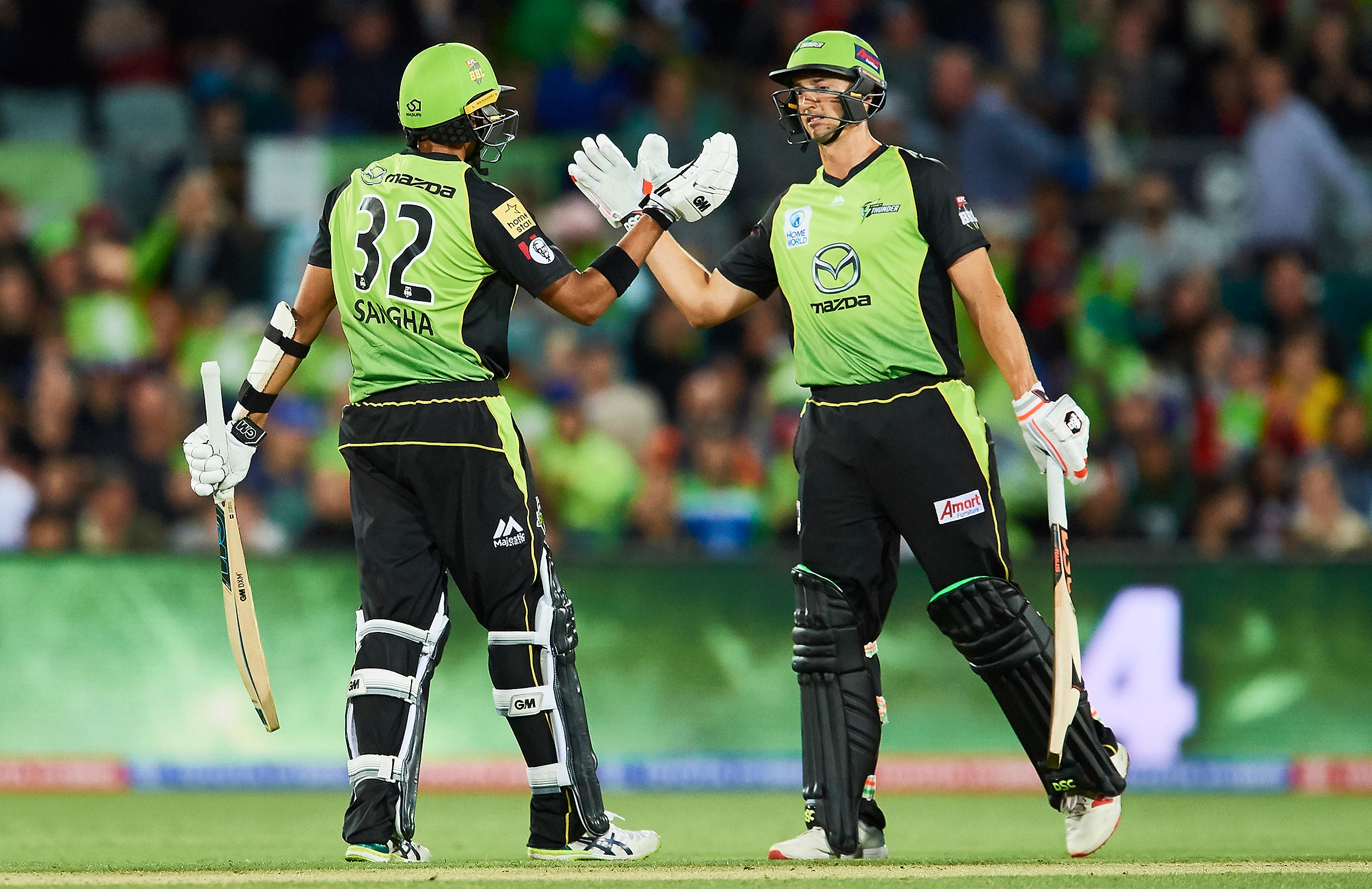Daniel Sams’ all-round performance and Jason Sangha’s unbeaten 63 saw the Sydney Thunder down the Melbourne Stars by 15 runs via the Duckworth-Lewis-Stern method.